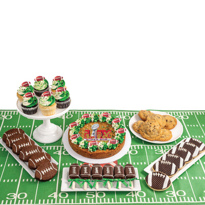 If you're on the fence on what to order and craving a bit of everything, our football cookies delivery service has come up with a range of bundled desserts. Packed with football brownies, cakesicles, assorted stuffed cookies, cupcakes, cookies, and a cookie cake as its centerpiece, the Super Bowl Party Sweets Bundle is a game-changer.