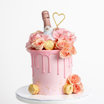 For those who like their Valentine cakes with a bit of booze, our Champagne Rose Cake is the perfect treat. This cake is decorated in delicate pink frosting, cascading roses, French macarons, and a mini champagne bottle on top.
