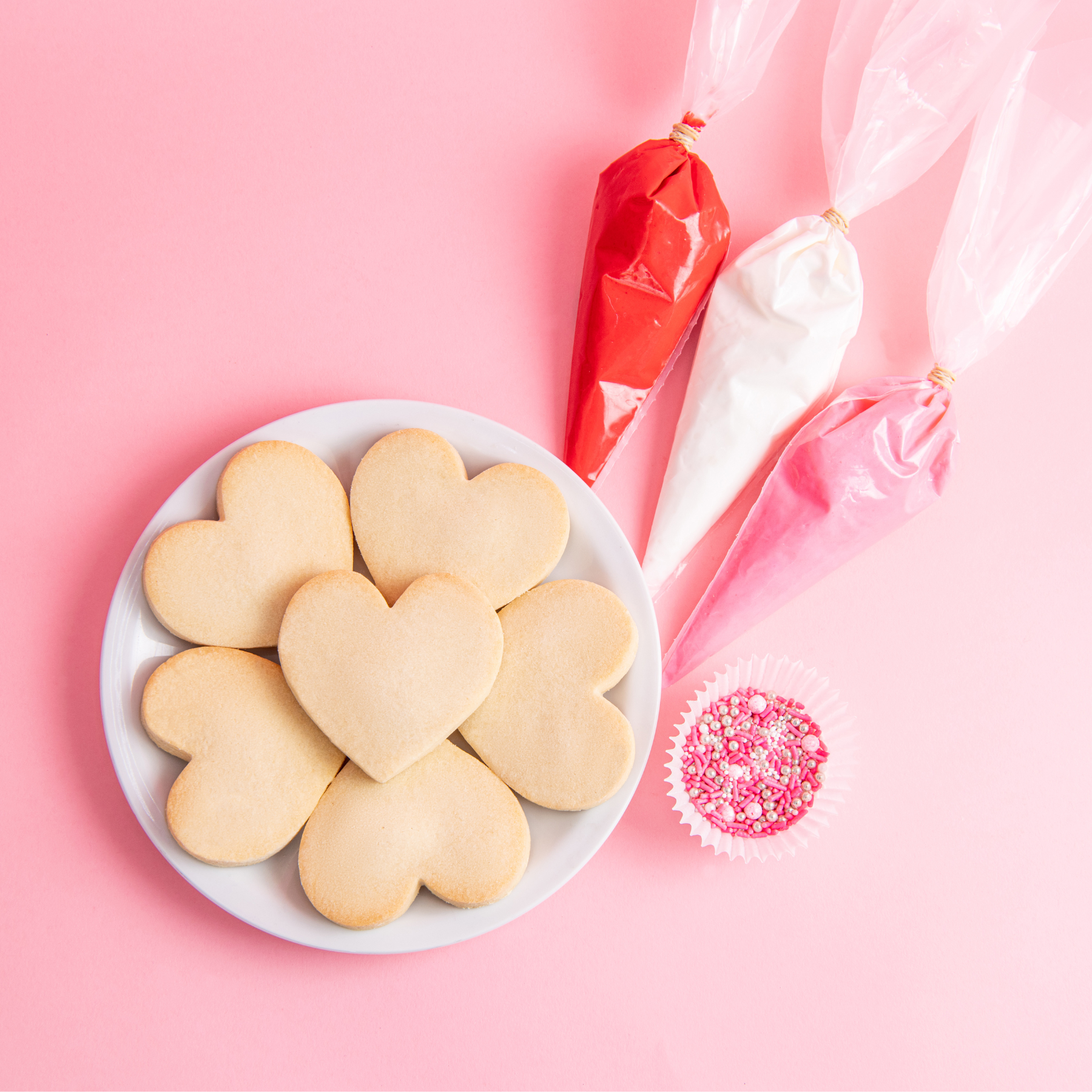 Heart-shaped shortbread sugar cookies, baked to perfection and ready for your personal touch. A palette of vibrant icing in Valentine's Day hues, featuring shades of pink and white for a festive touch. Valentine-themed sprinkles to add that extra sprinkle of love and sweetness.