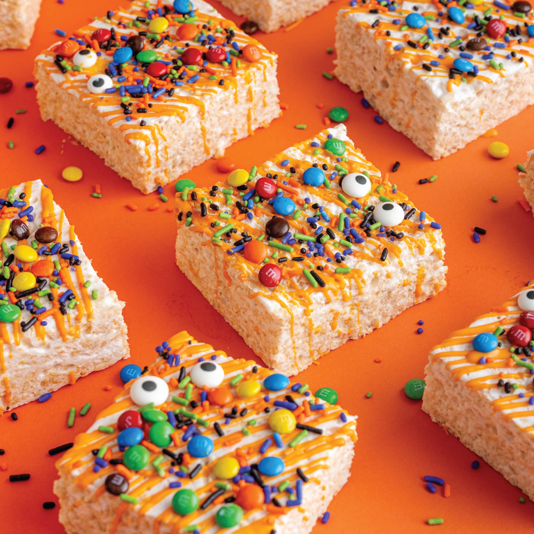 Our delightful Sweet E's Halloween Rice Krispies have embraced the Halloween spirit with a playful makeover. These spooky Halloween brownies are here to add a touch of eerie excitement to your festivities. Dressed up in a cloak of rich chocolate fudge, they're adorned with curious, googly eyes and colorful Halloween candies that make them a sight to behold.