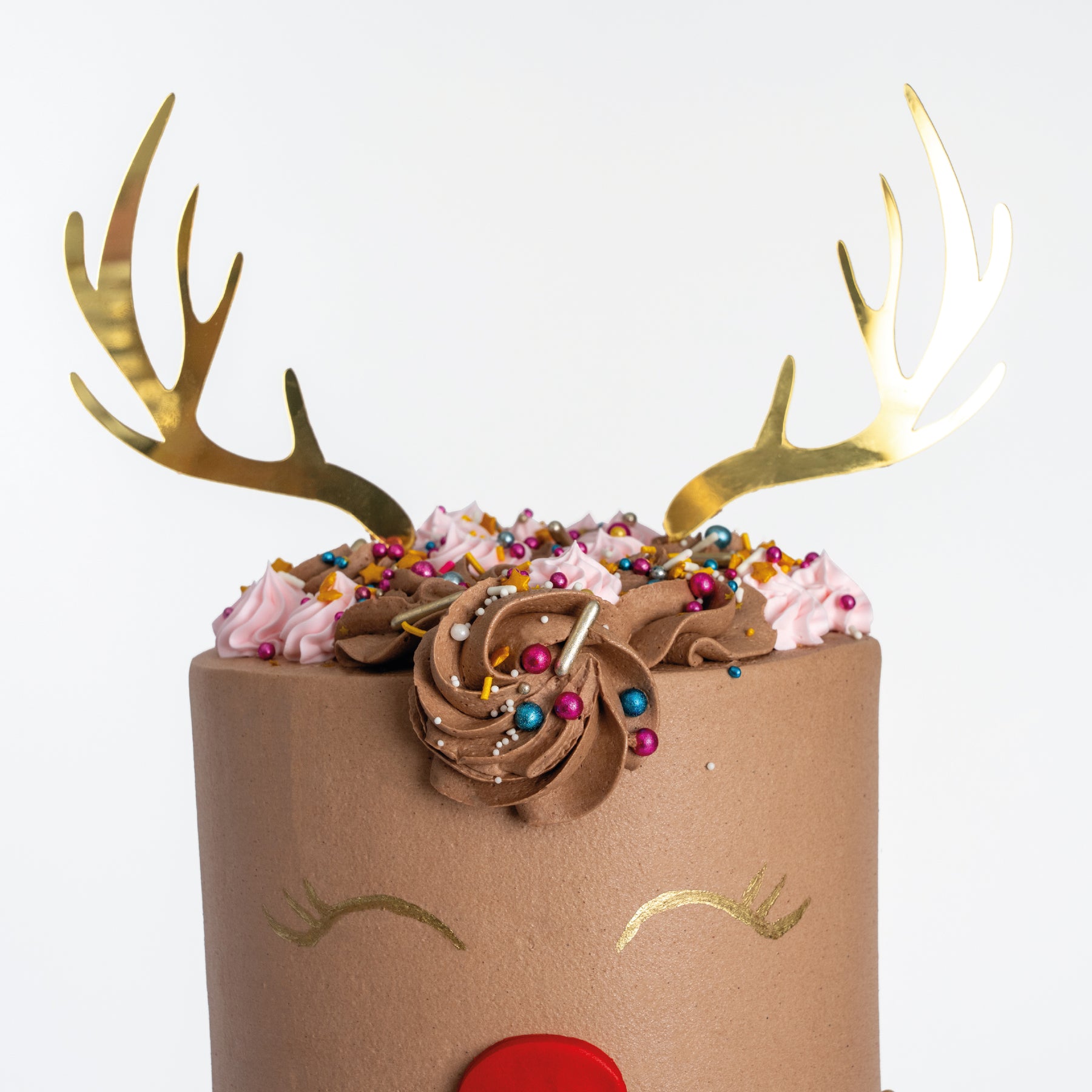 Our Reindeer Christmas Cake is a true showstopper. It's generously coated with velvety chocolate buttercream frosting, adding a layer of indulgence to every bite. But what truly sets it apart is the enchanting decoration. Golden glitter reindeer horns, ears, and the cutest little face adorn this cake, turning it into a whimsical work of art that captures the spirit of the season.