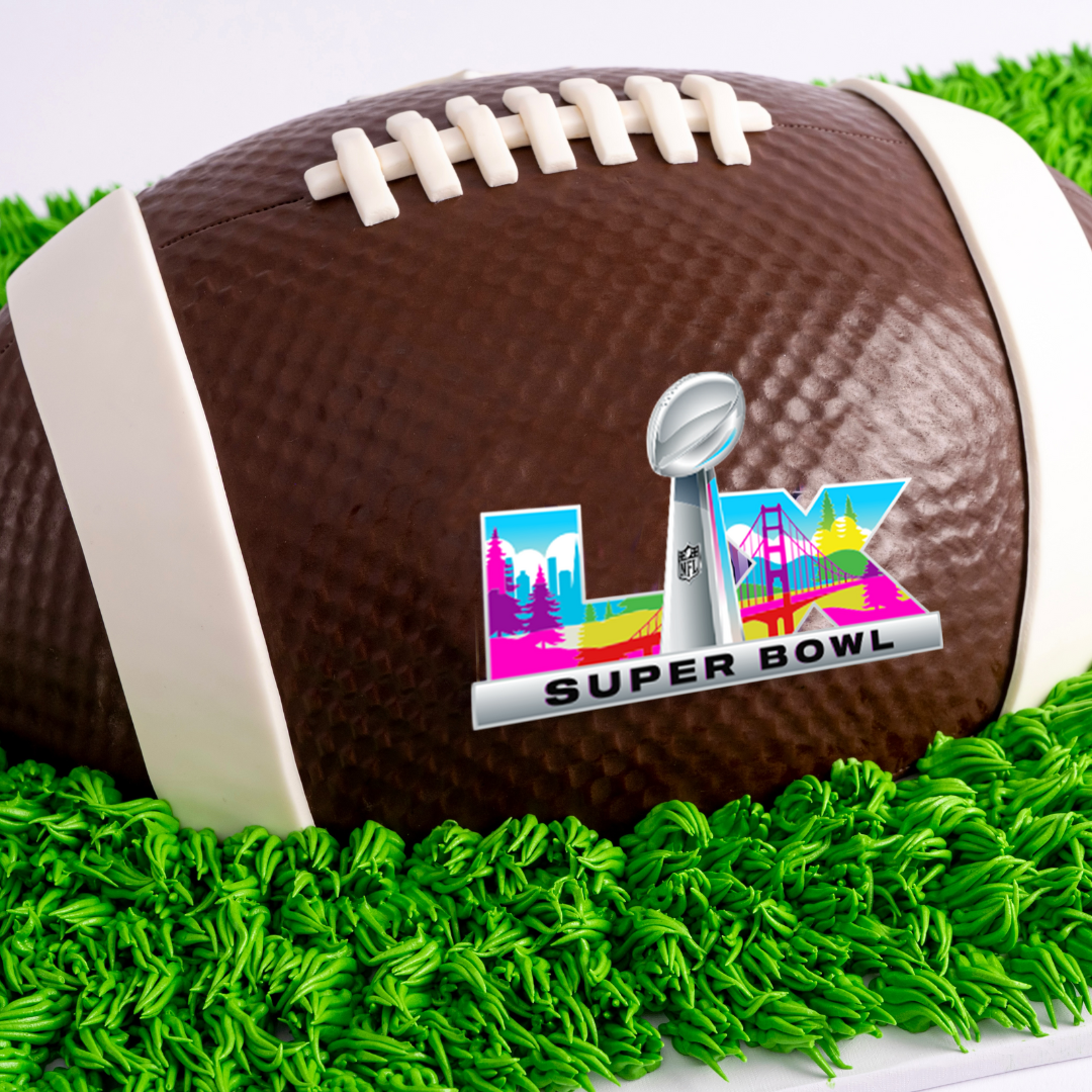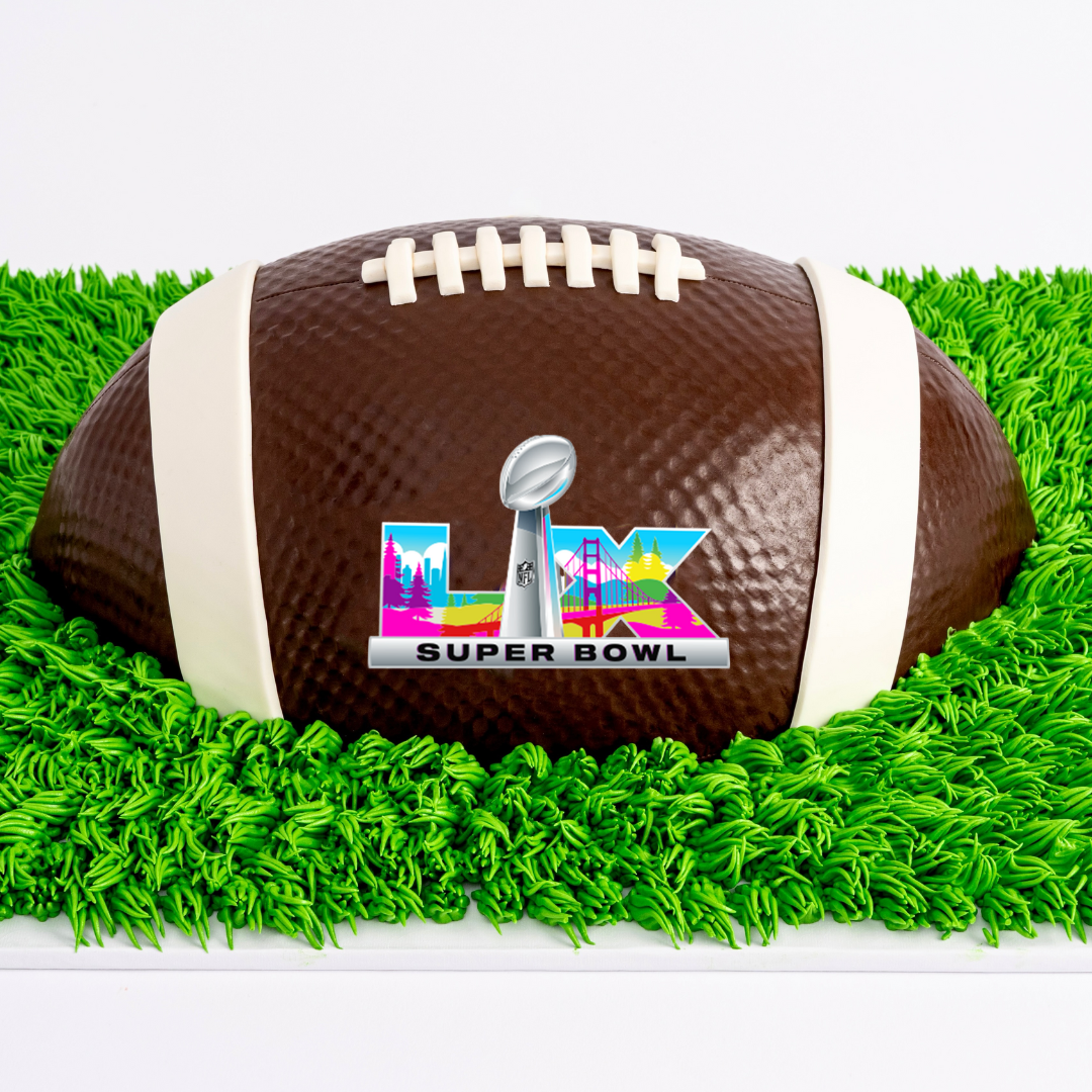 Sweet E's hand-sculpted Football Cake is a true stunner that will surely wow your guests at your Super Bowl party. This superbowl cake is 2-Dimensional with the Super Bowl LVIII logo on one side and the NFL logo on the other side. Perfect as a beautifully sweet centerpiece to be viewed from all angles on your game day dessert table.